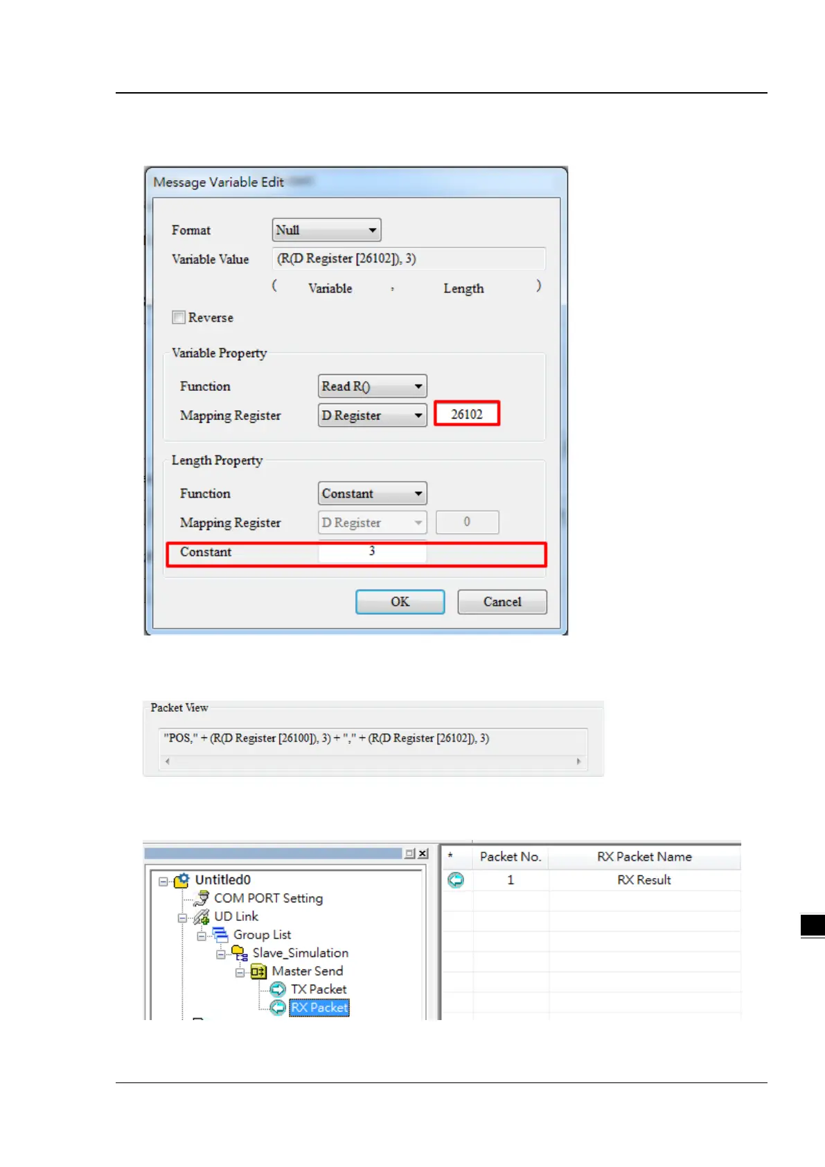 Click OK and verify the values (”POS,”+RD Register [26102], 3)) in the Packet View.