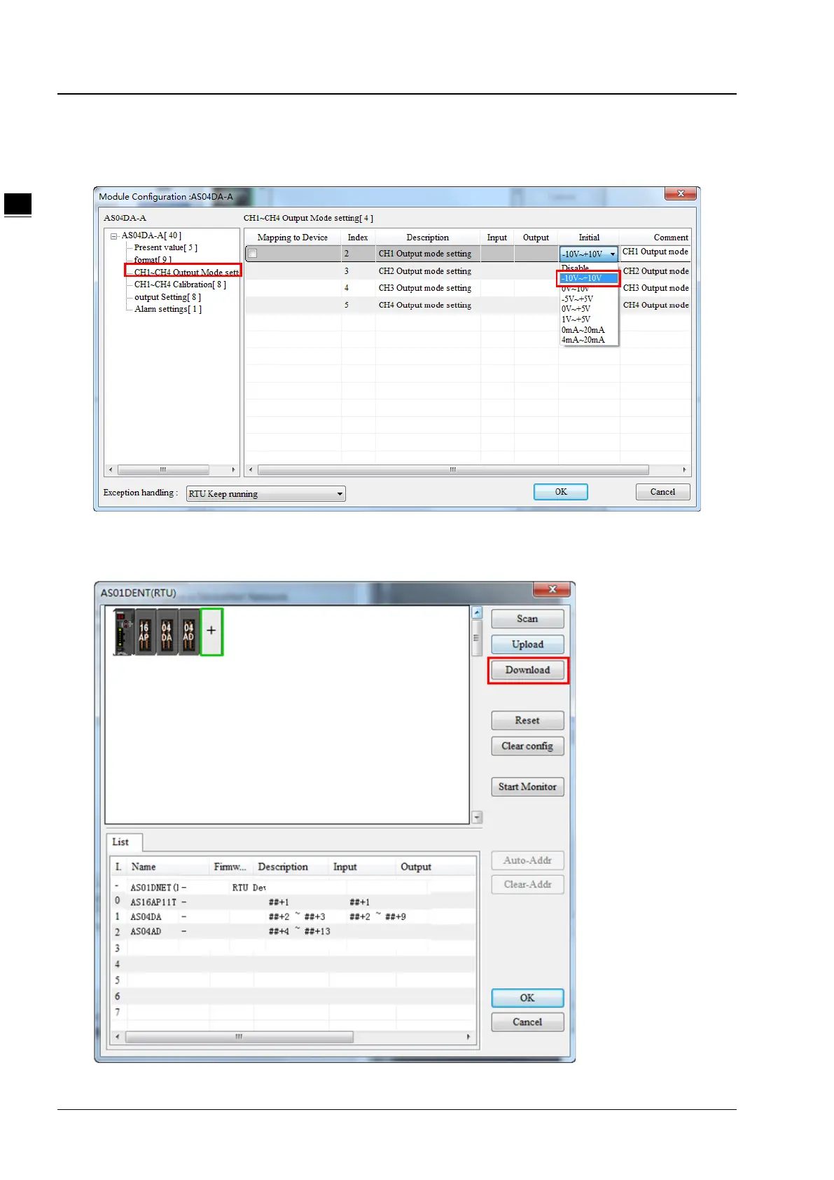 8. After the module is scanned, configure module parameters. Double click AS04DA module and select “-10V~+10V