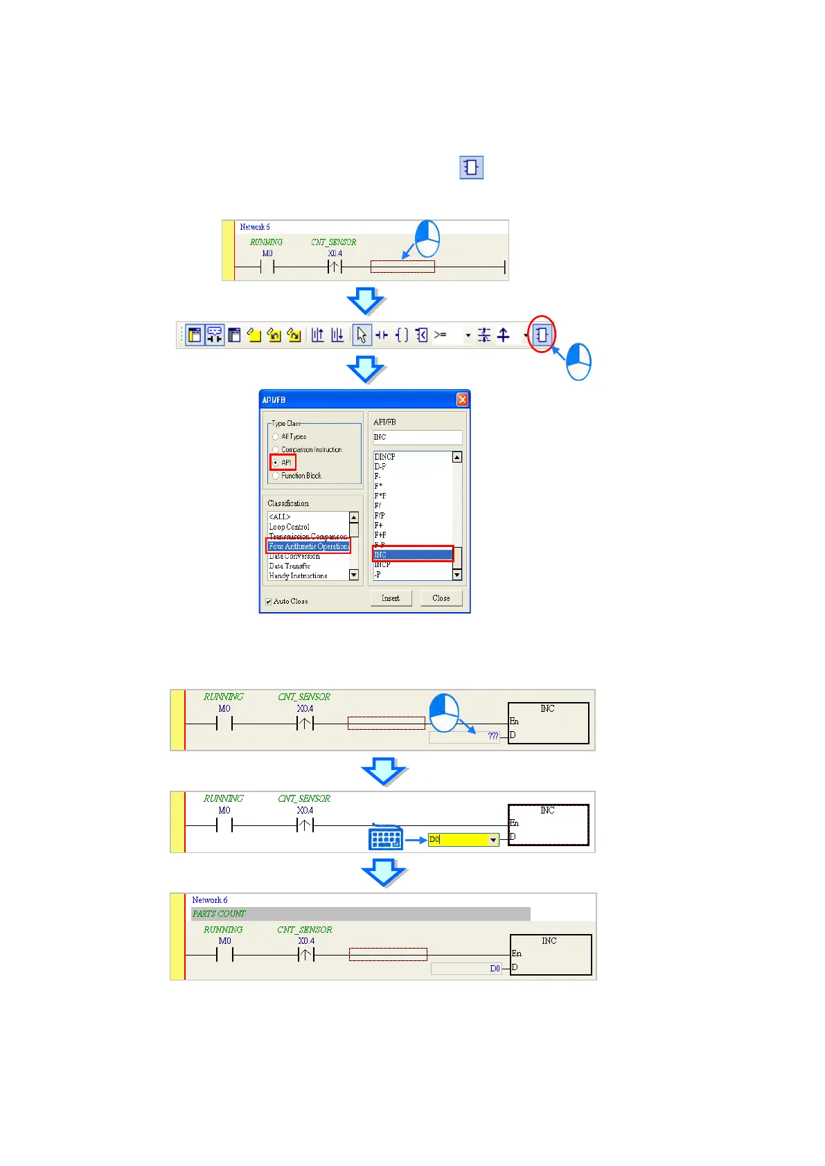 After you insert the instruction, assign a device address to the operand, and write the program shown