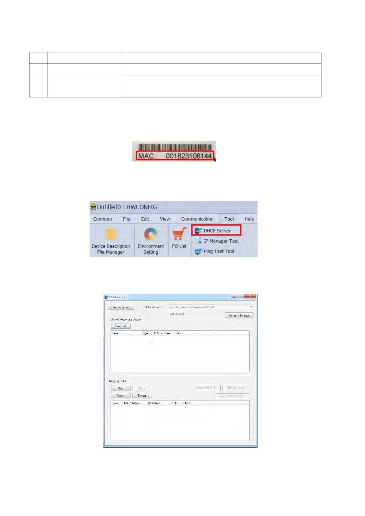 HWCONFIG : Click Tool and then click DHCP Server.