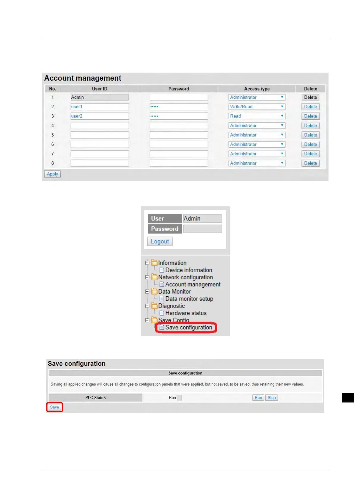 b. Set up the User ID, the password and the access type. After editing, click “Apply” to save the setting or click
