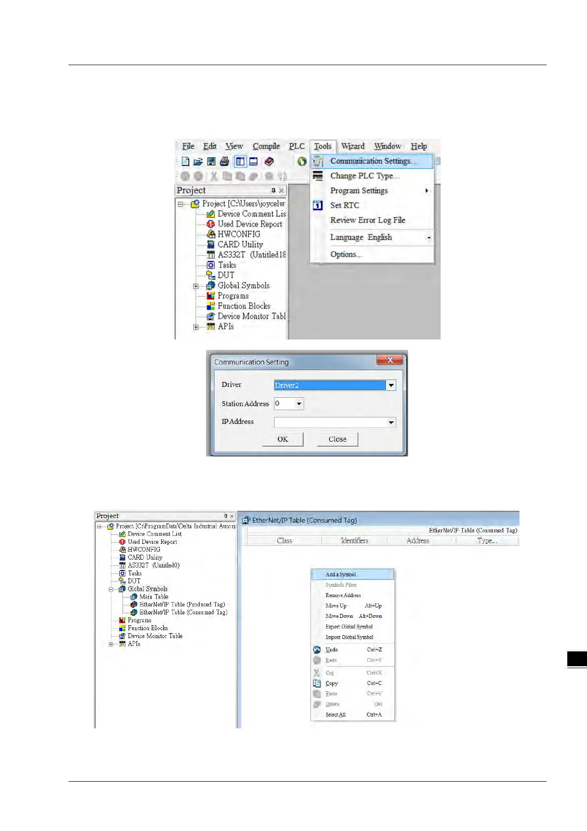 1. Start ISPSoft and click Tools -> Communication Settings and select a driver with Ethernet communication.