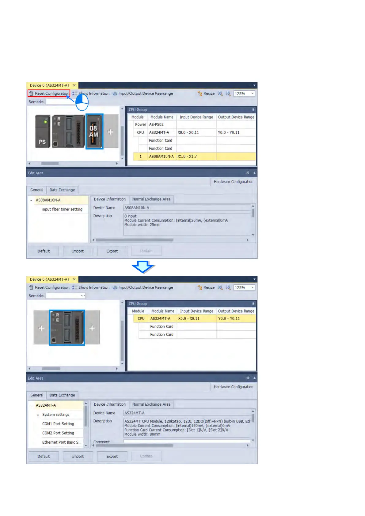 Use the functional button Reset Configuration to set the PLC configurations back to default values.