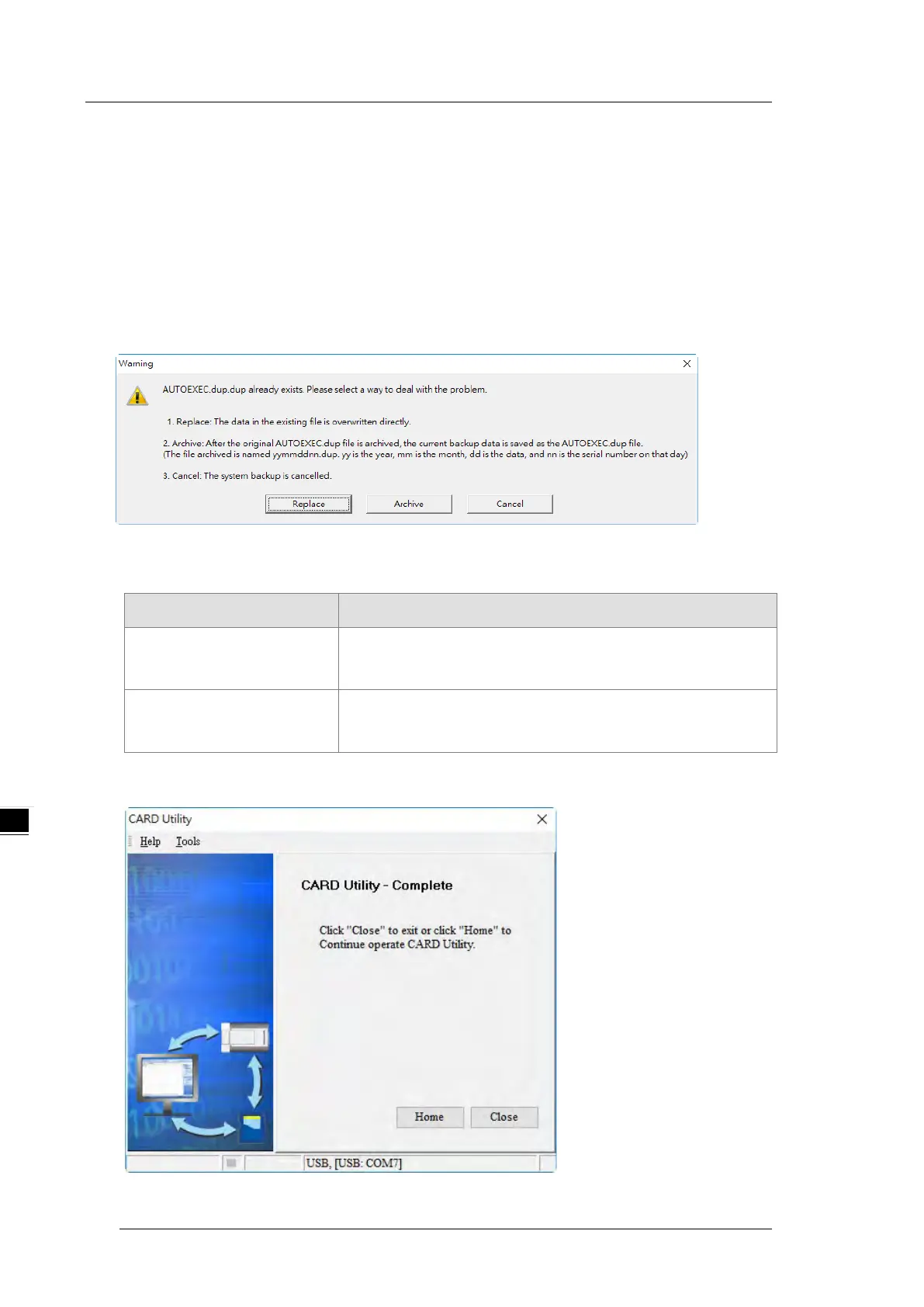 old backup file in the memory card, the Warning message appears. Click Replace, Archive, or Cancel in