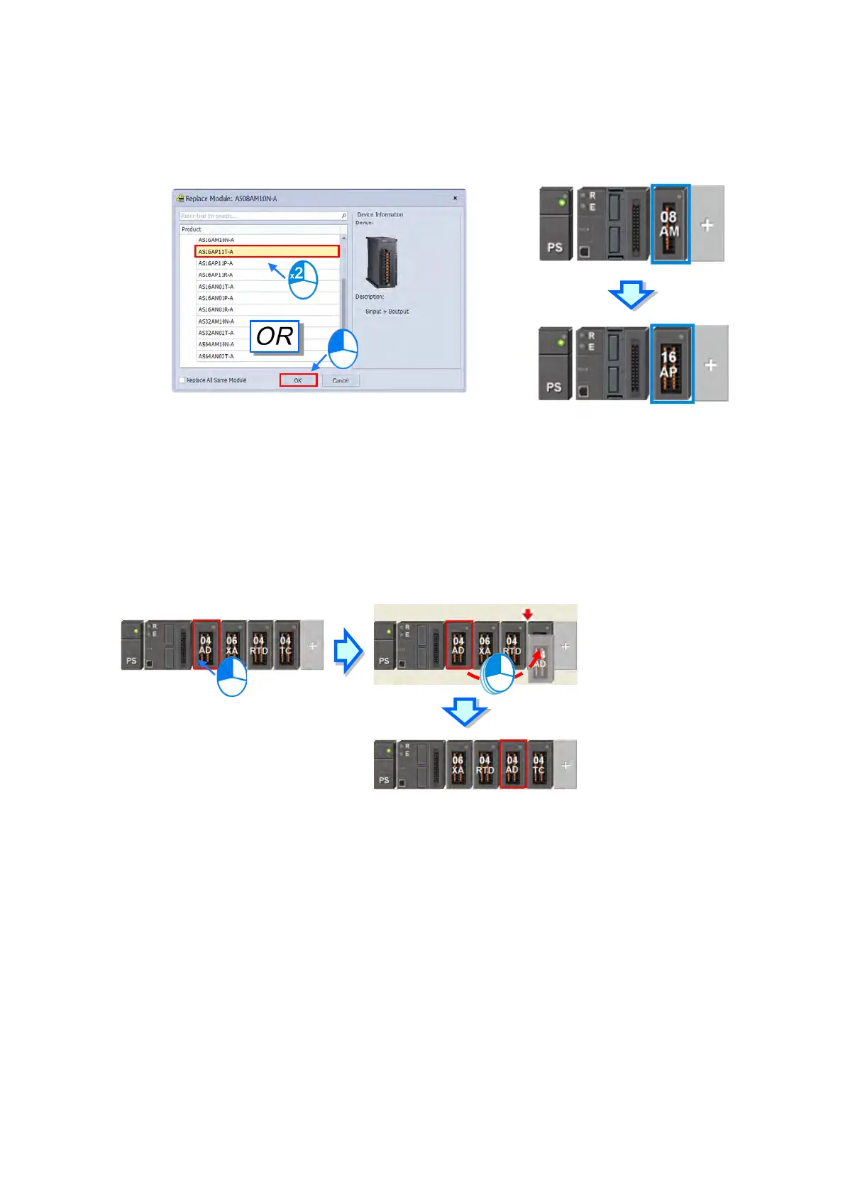 Except CPU modules, you can drag and drop all module graphics in Hardware Configuration area to rearrange their
