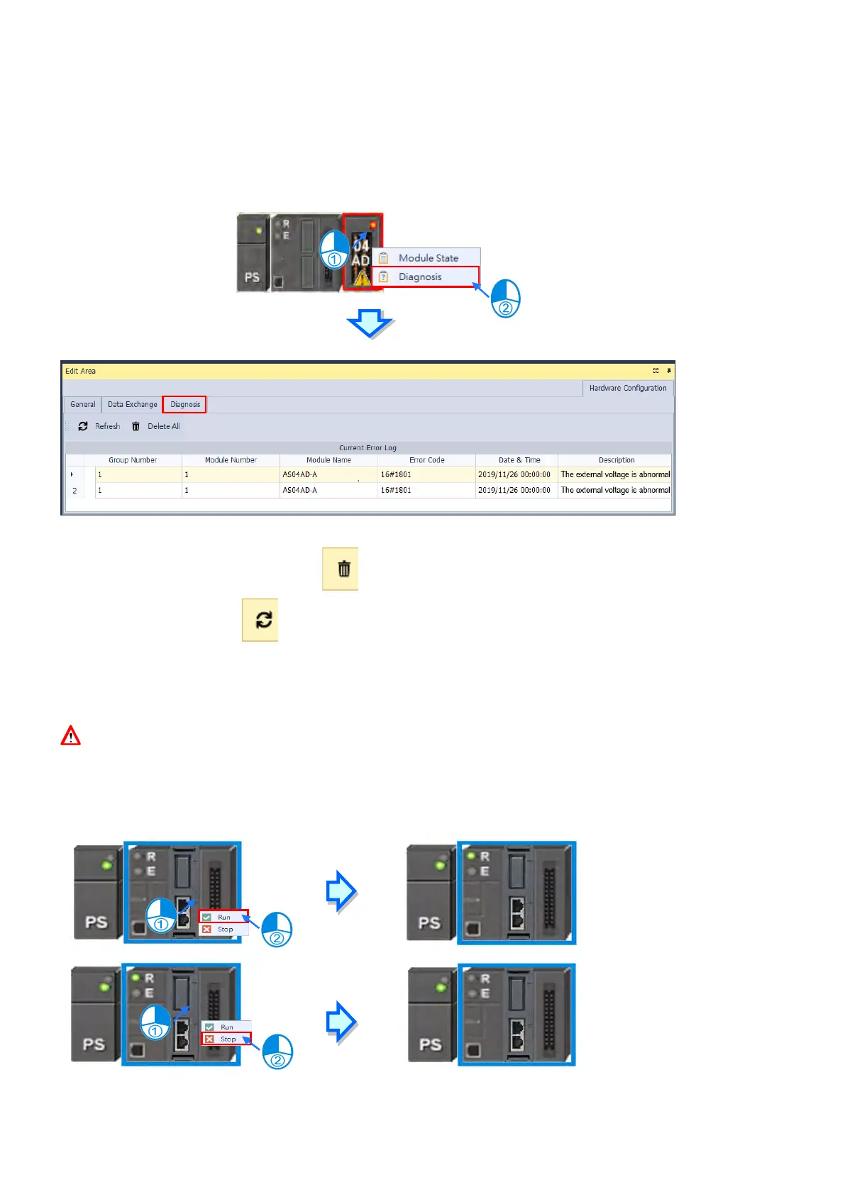 To check the module state and diagnosis, first you need to be in the online mode. Right-click the module that you want