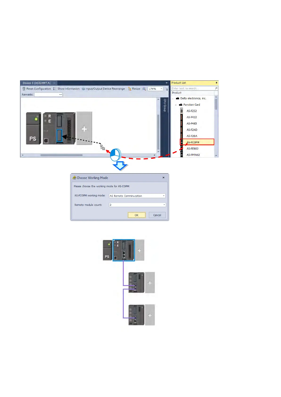 Drag AS-FCOPM from the Product List to the Function Card Slot 2 of the PLC CPU. After that you can set the Working