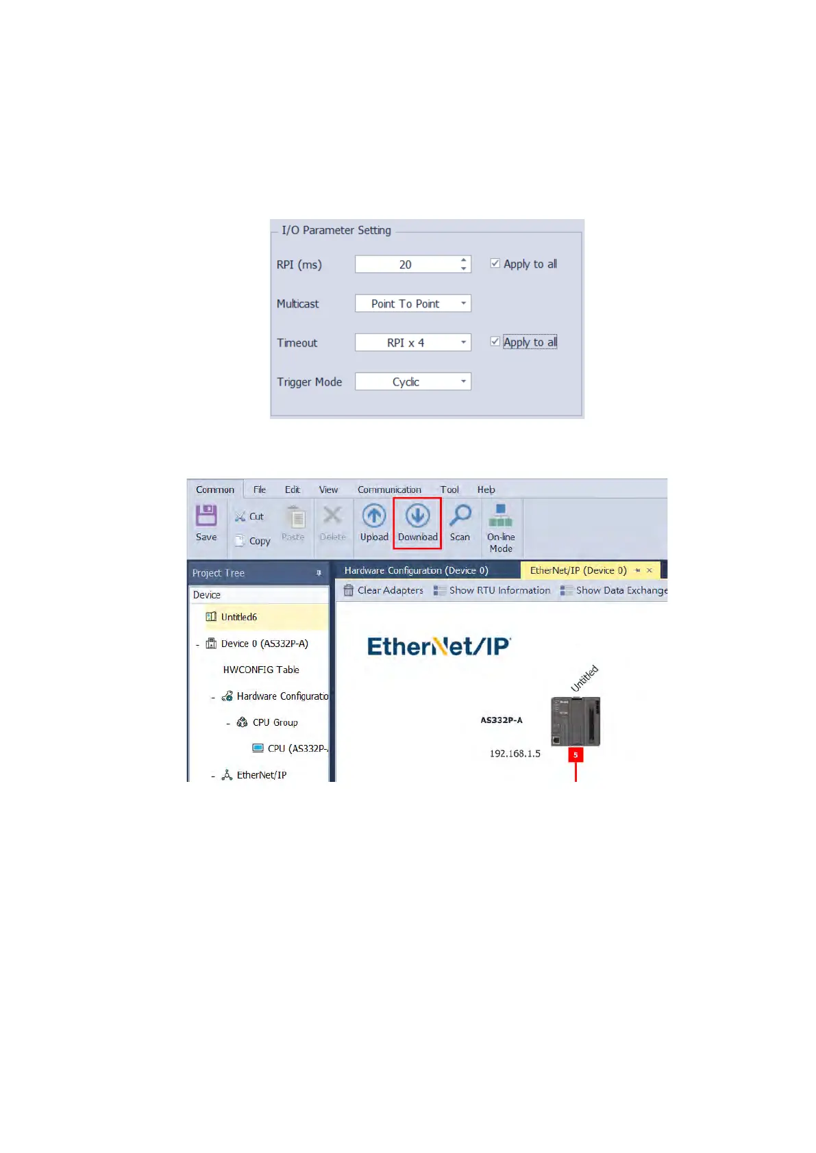 Click Download on the tool bar of the EtherNet/IP page to open the Download setting page.
