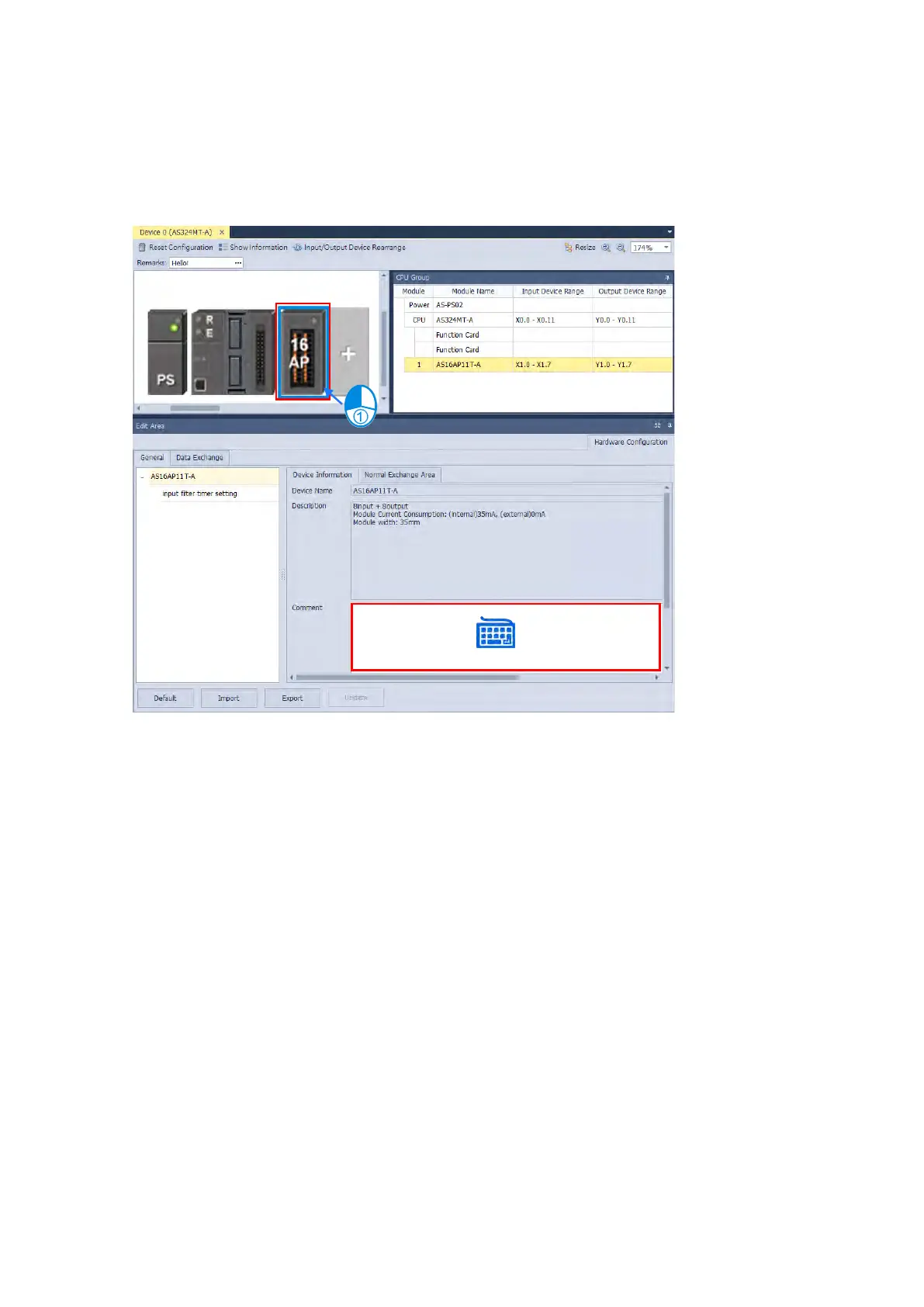 Click the module graphic and you can see its details in the Edit Area. You can leave comments for the PLC CPU and