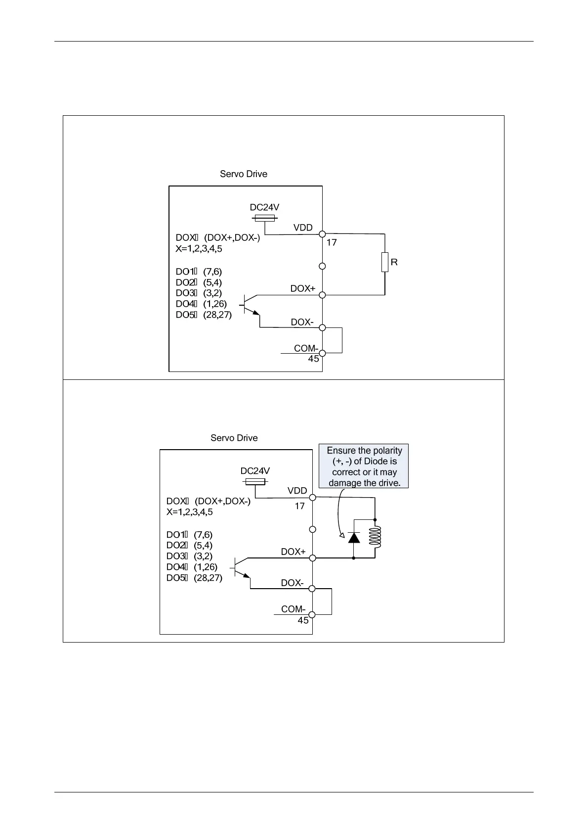 C5: Wiring of DO signal. The servo drive applies to the internal power and the resistor is