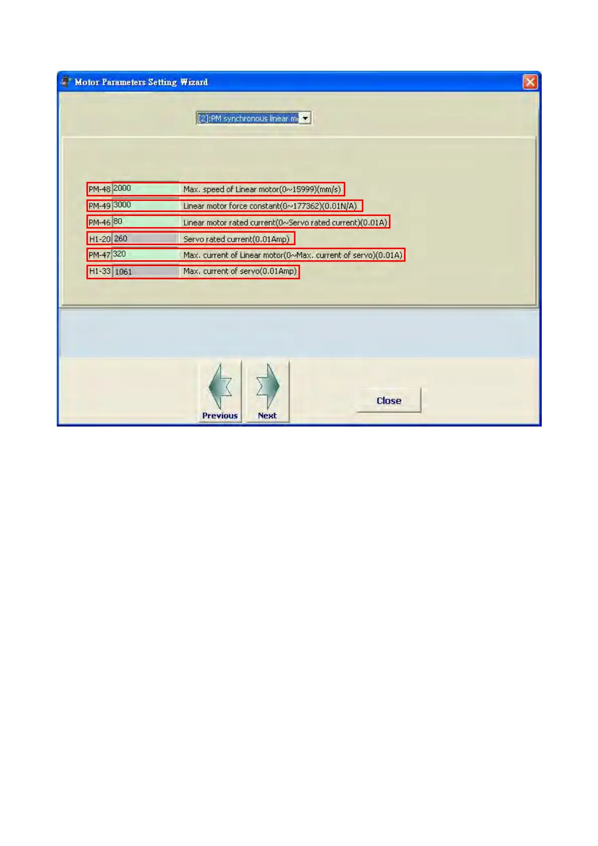 2. The force constant of PM synchronous linear motor: range: 0~177362; unit: 0.01N/A