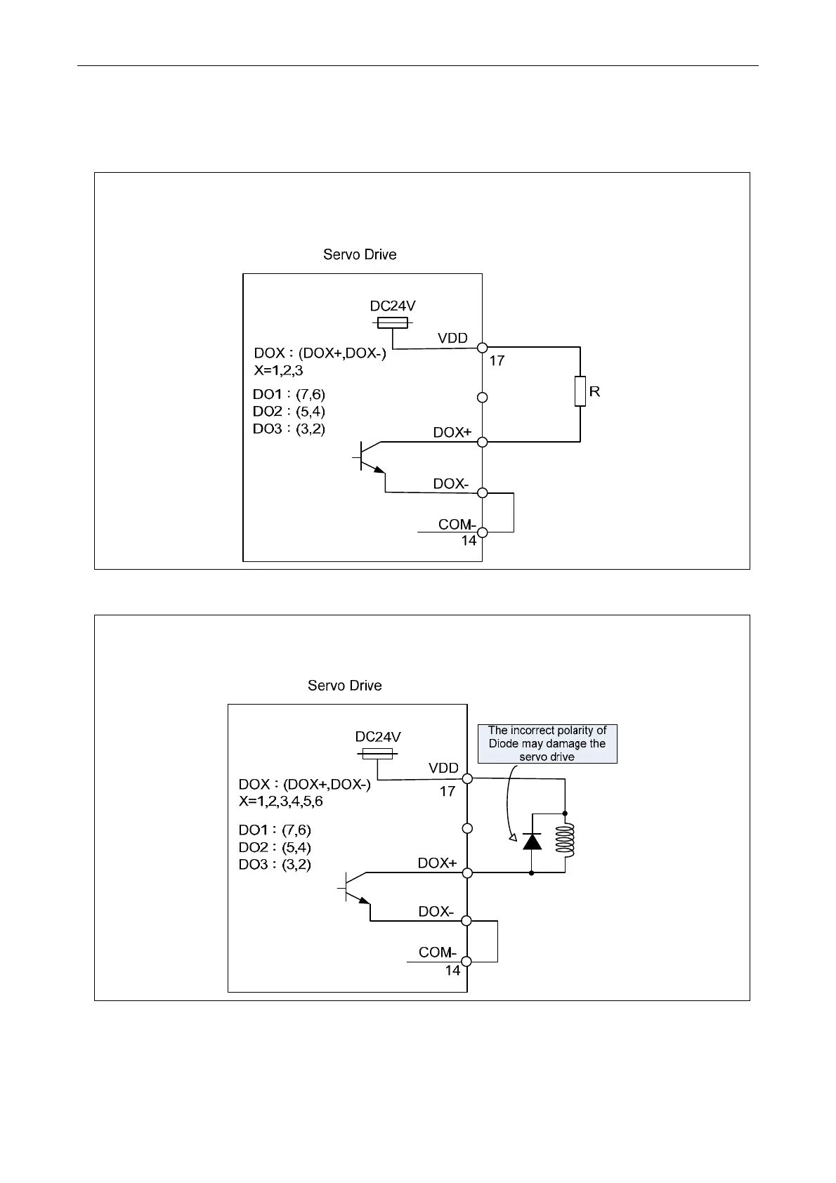 C6: Wiring of DO signal. The servo drive applies to the internal power and the resistor is
