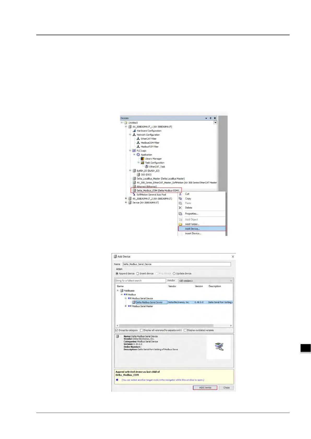 2. Find and double-click Delta Modbus Serial Devie (Fieldbuses -> Modbus -> Modbus Serial Master -> Delta