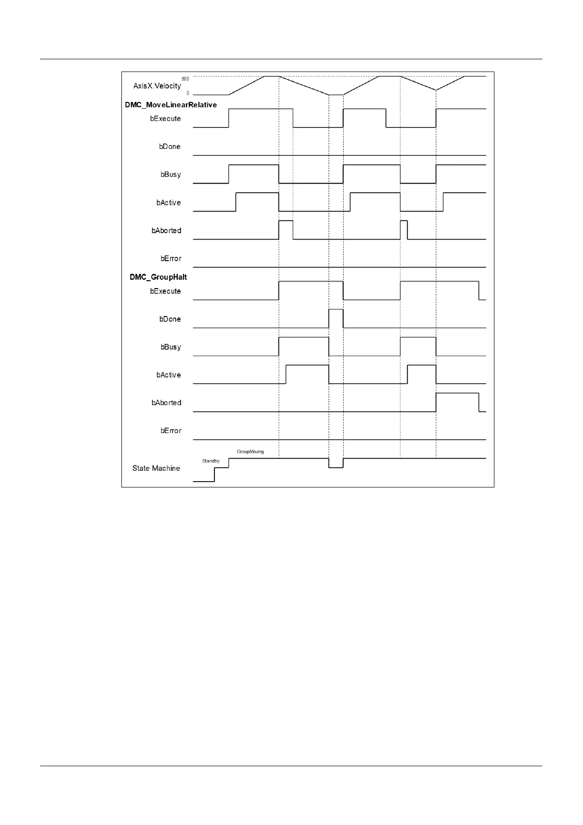 instruction execution, DMC_GroupHalt will be aborted by changing bExecute of DMC_MoveLinearRelative to