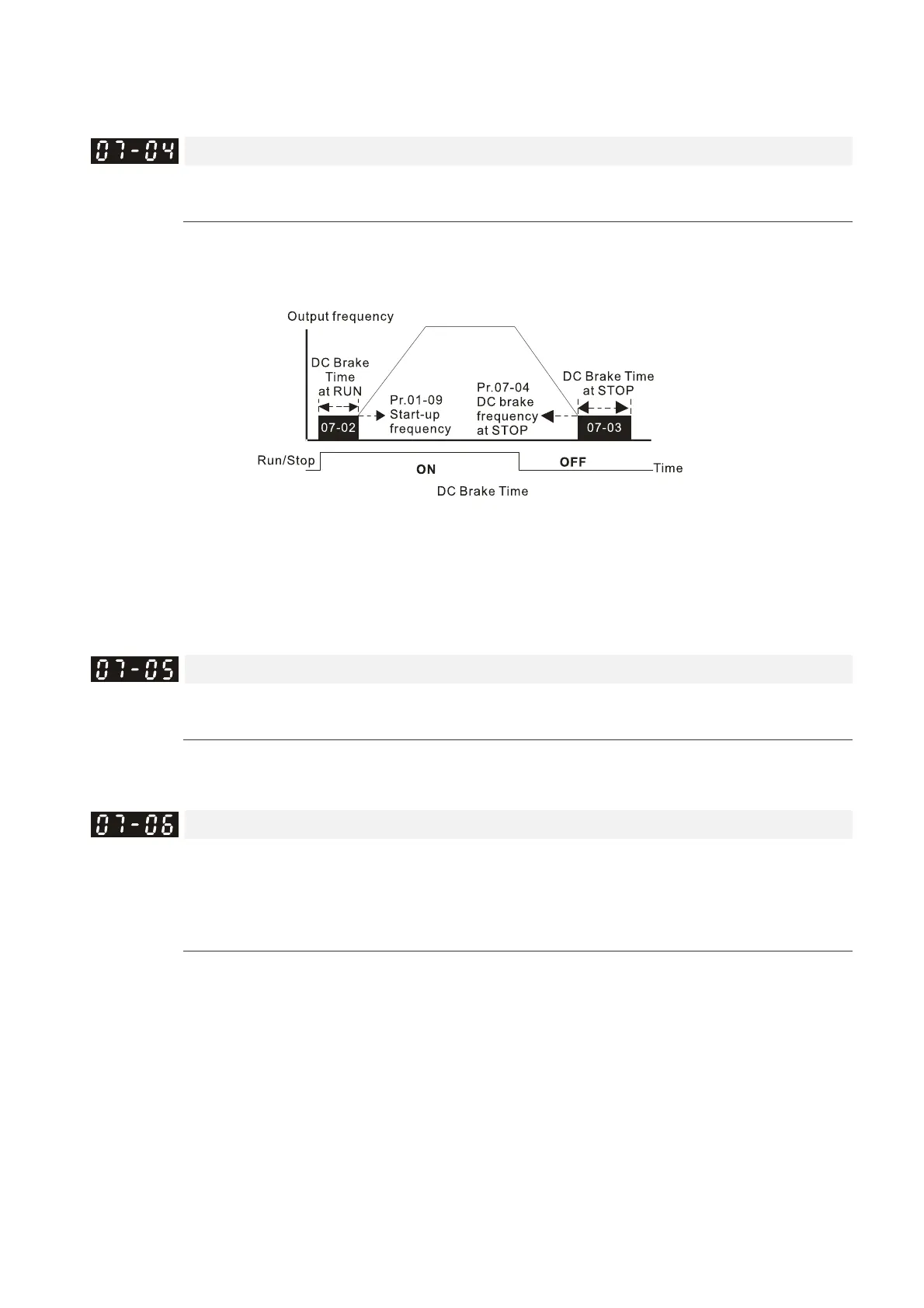 Related parameters: Pr.00-22 Stop Method, Pr.07-04 DC Brake Frequency at STOP.