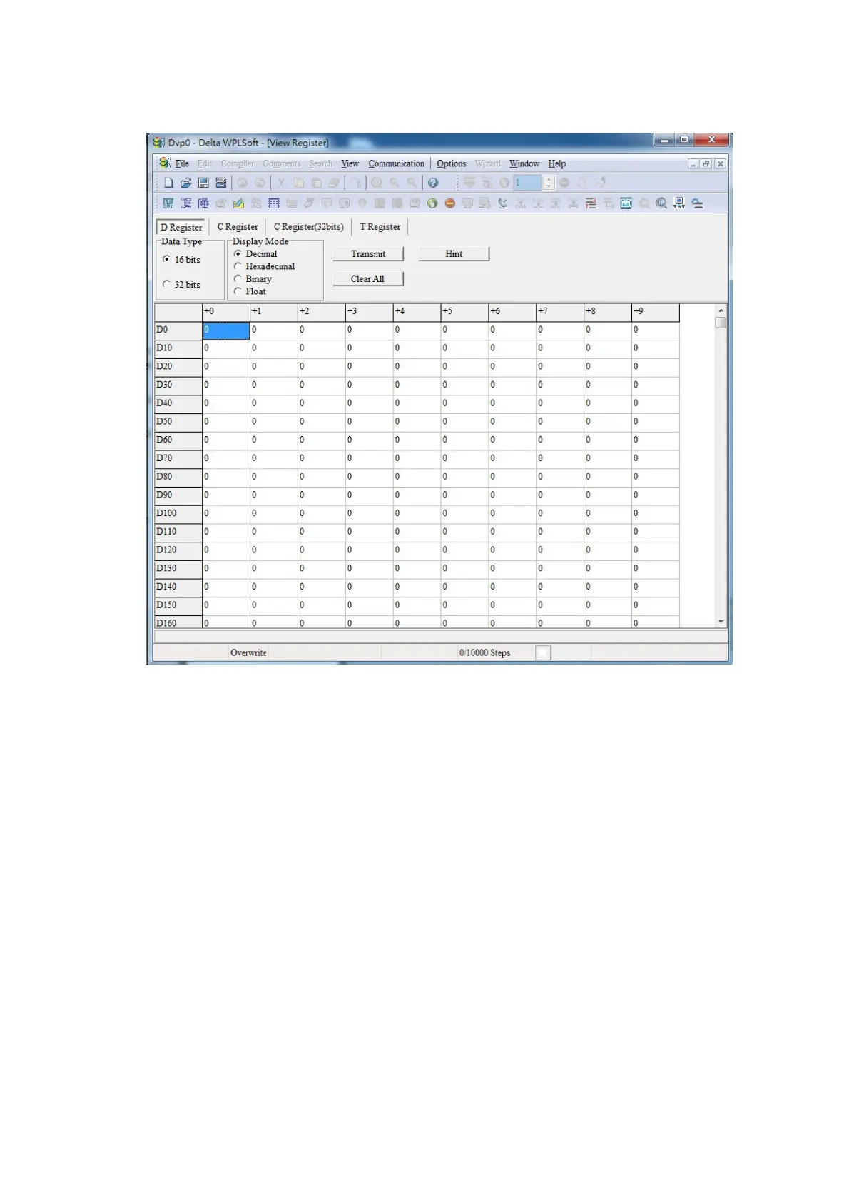 After leaving the PLC register window, the register setting screen will appear, as shown