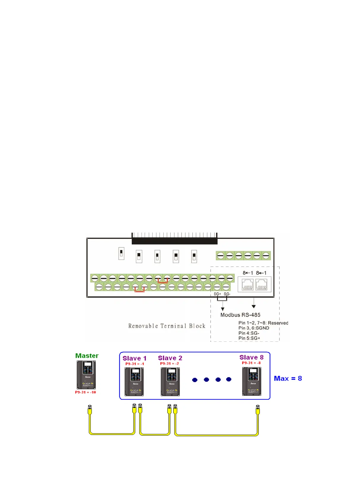 Set Pr.09-31 = -1 to -8 in order to access 8 nodes, and set Pr.00-20 = 1 to define the control