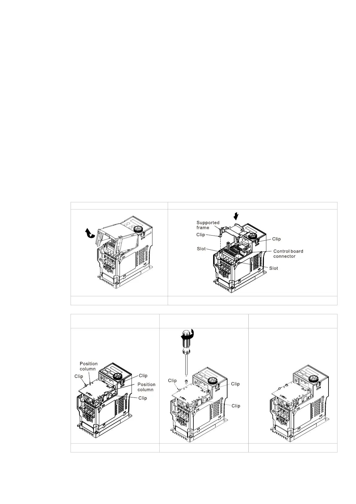Assemble the supported frame of the option card: Aim the two clips at the two slots on the motor