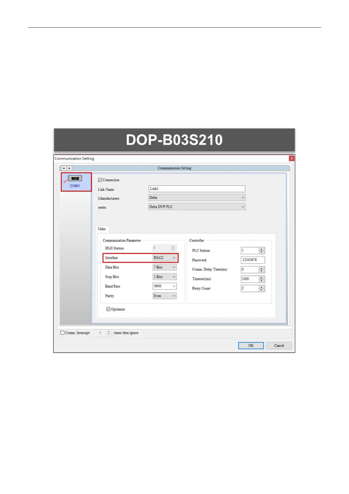 When you set COM1 of DOP-B03S210 as RS422, it automatically converts to COM2 as RS422