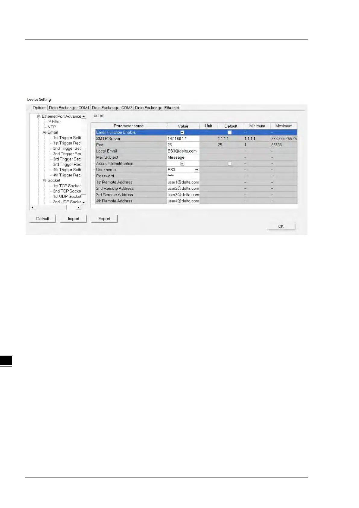 Set an IP address of the SMTP server. Set the COM port of SMTP server at the COM port and set the sender’s