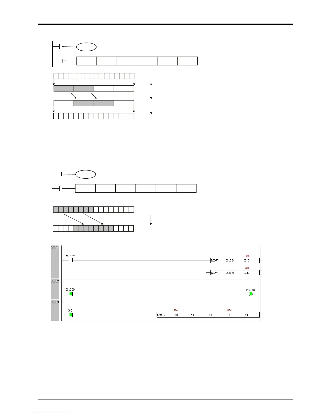 When M1168 = ON (in BIN mode) and SMOV instruction is in use, D10 and D20 will not be converted in BCD format