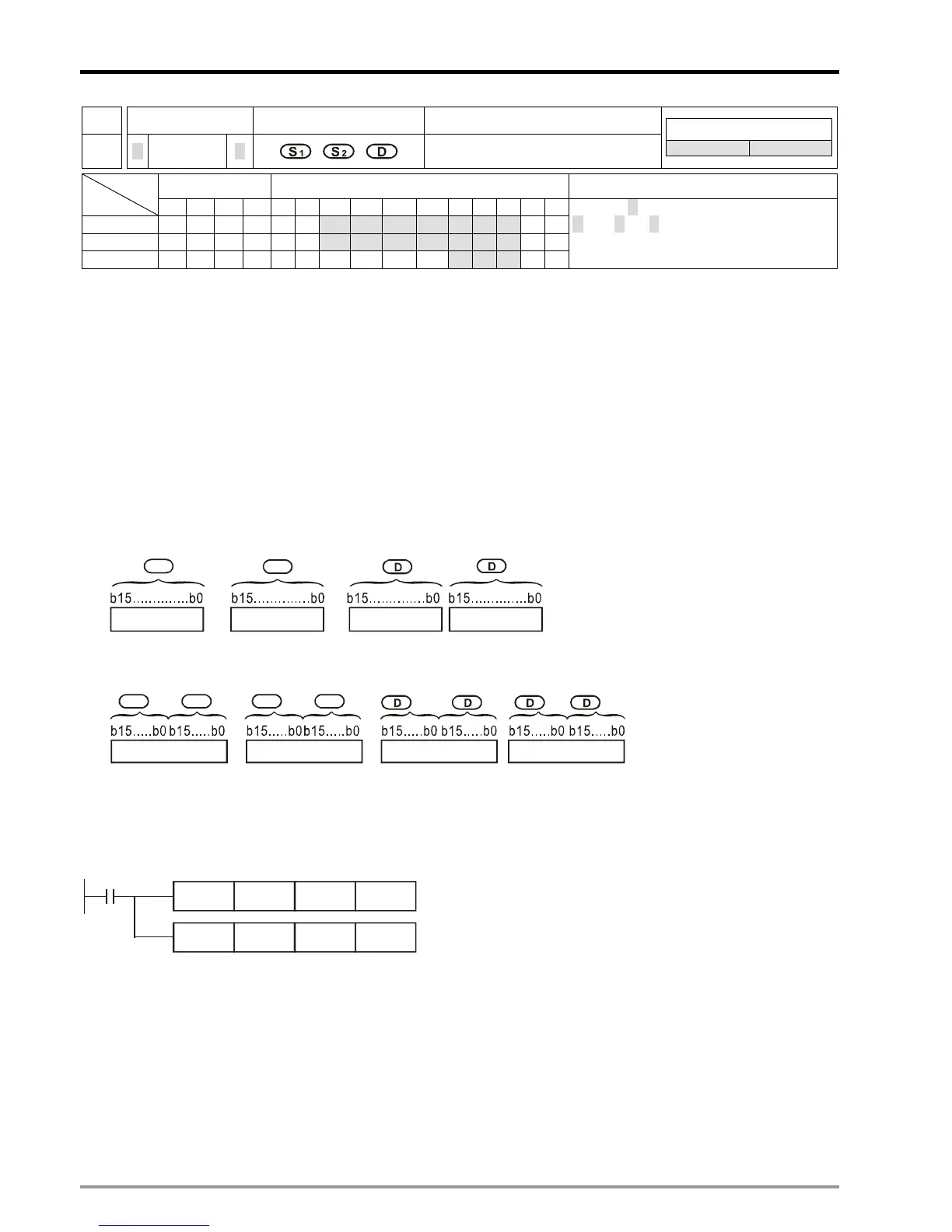 When X0 = ON, D0 will be divided by D10, and the quotient will be stored in D20 while remainder in D21. ON/OFF of