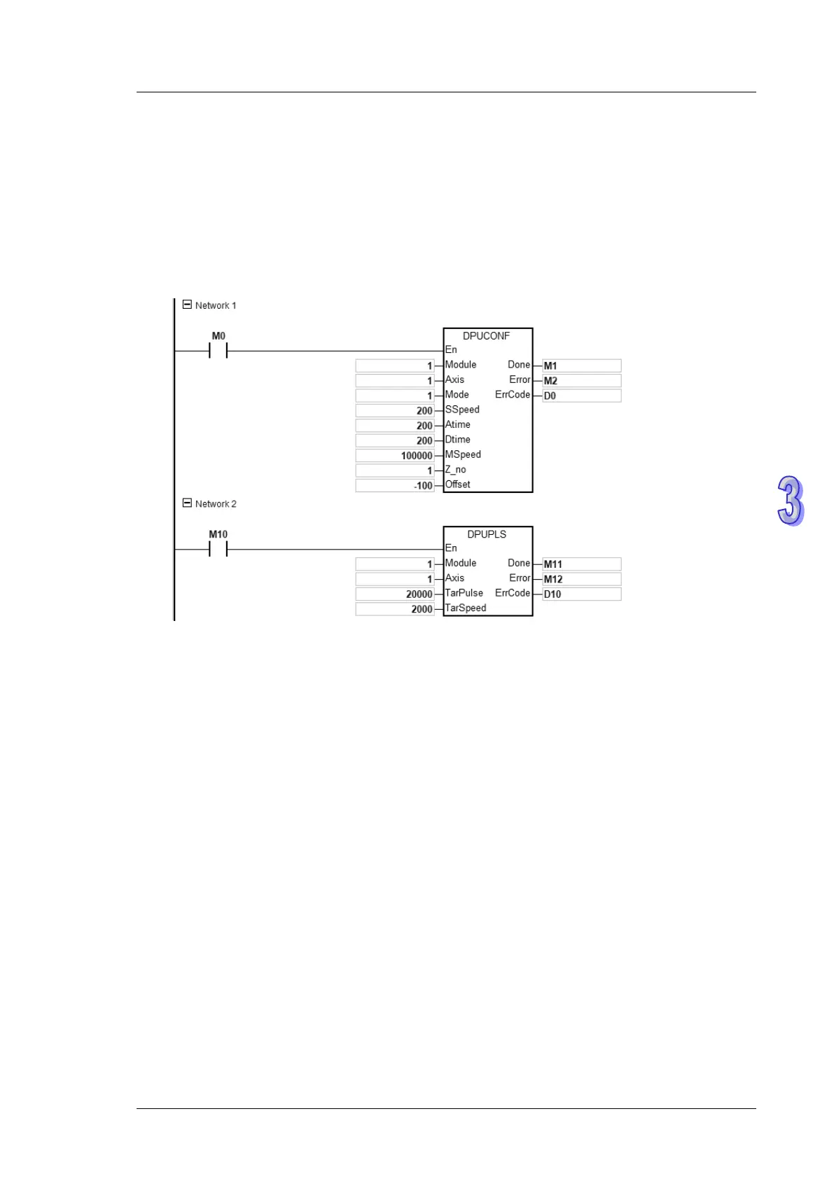 1. When M0 is ON, the DPUCONF instruction for axis 1 is executed to modify the parameters by