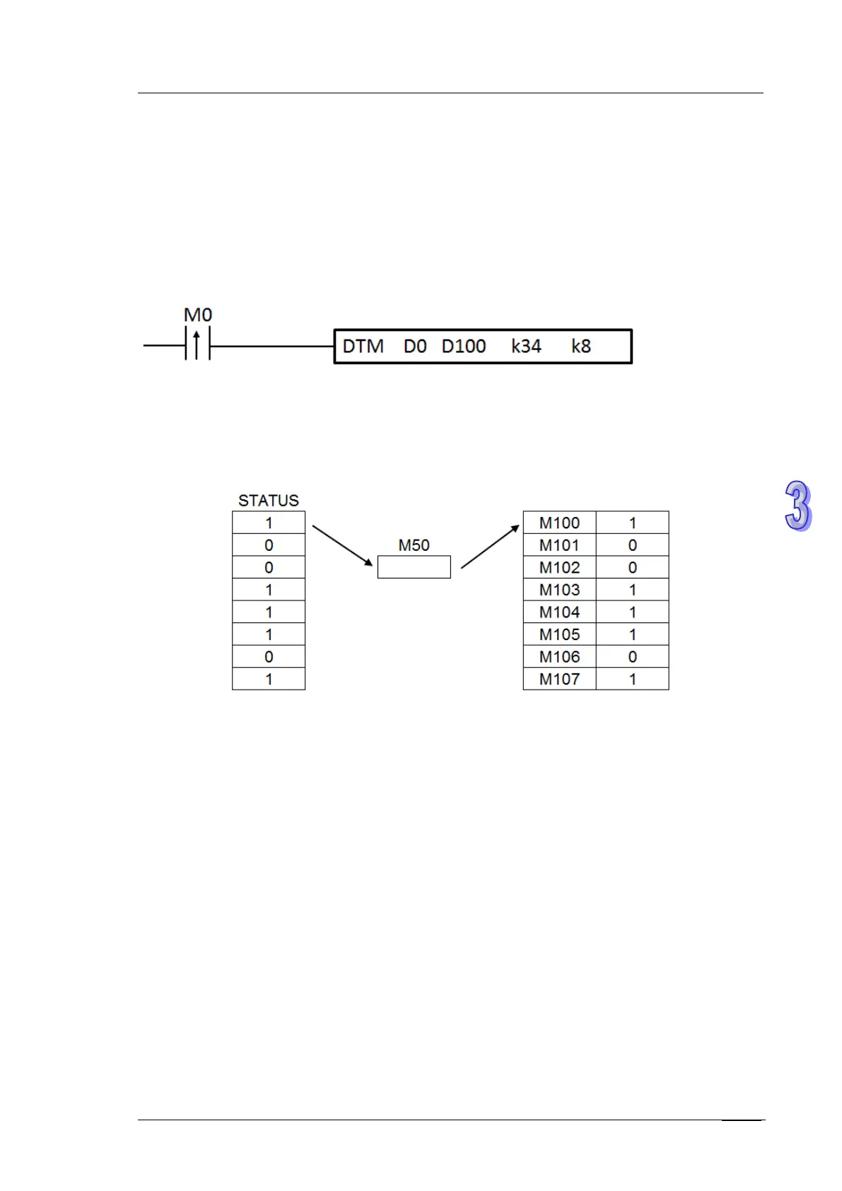 1. Set D0=K50 and D100=K100, and execute the instruction DTM will copy the values stored