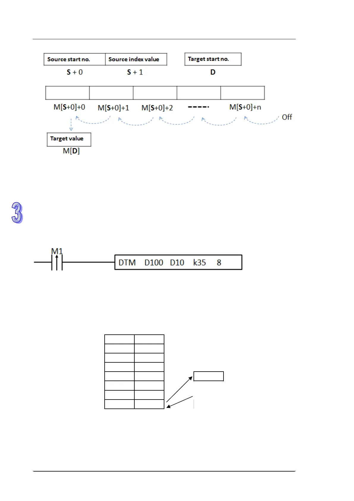 1. Set D100=K100 and D10=K70, and execute the instruction DTM will copy the states in