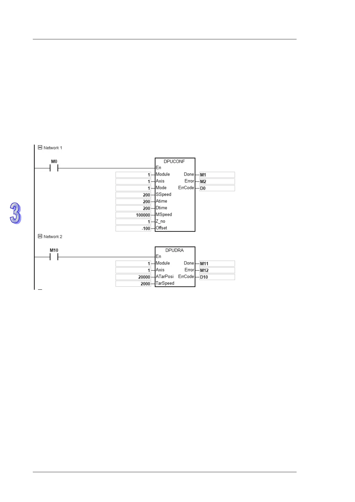 1. When M0 is ON, the DPUCONF instruction for axis 1 is executed to modify the parameters by