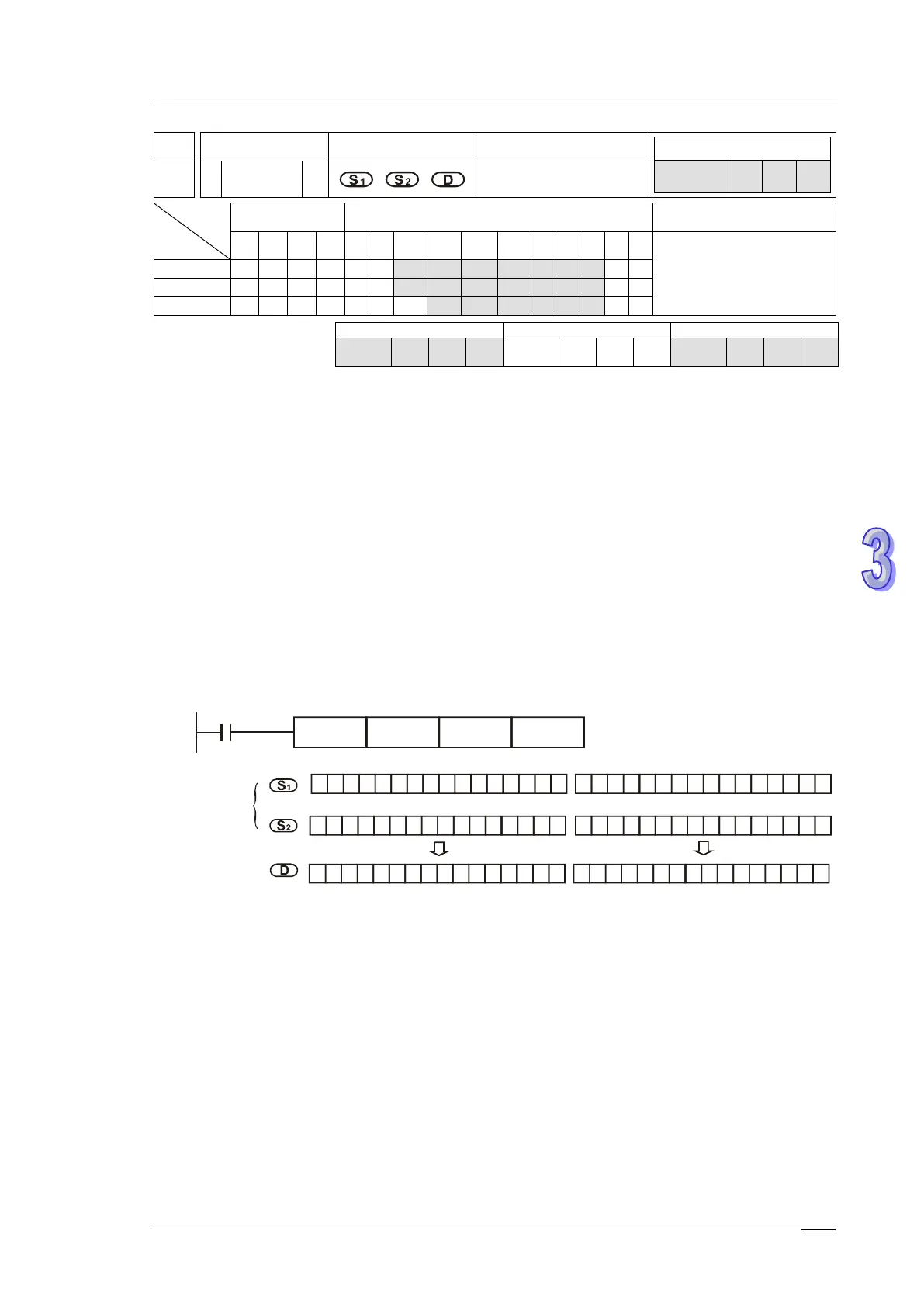 When X1 = ON, the 32-bit data source (D11, D10) and (D21, D20) are analyzed and the operation