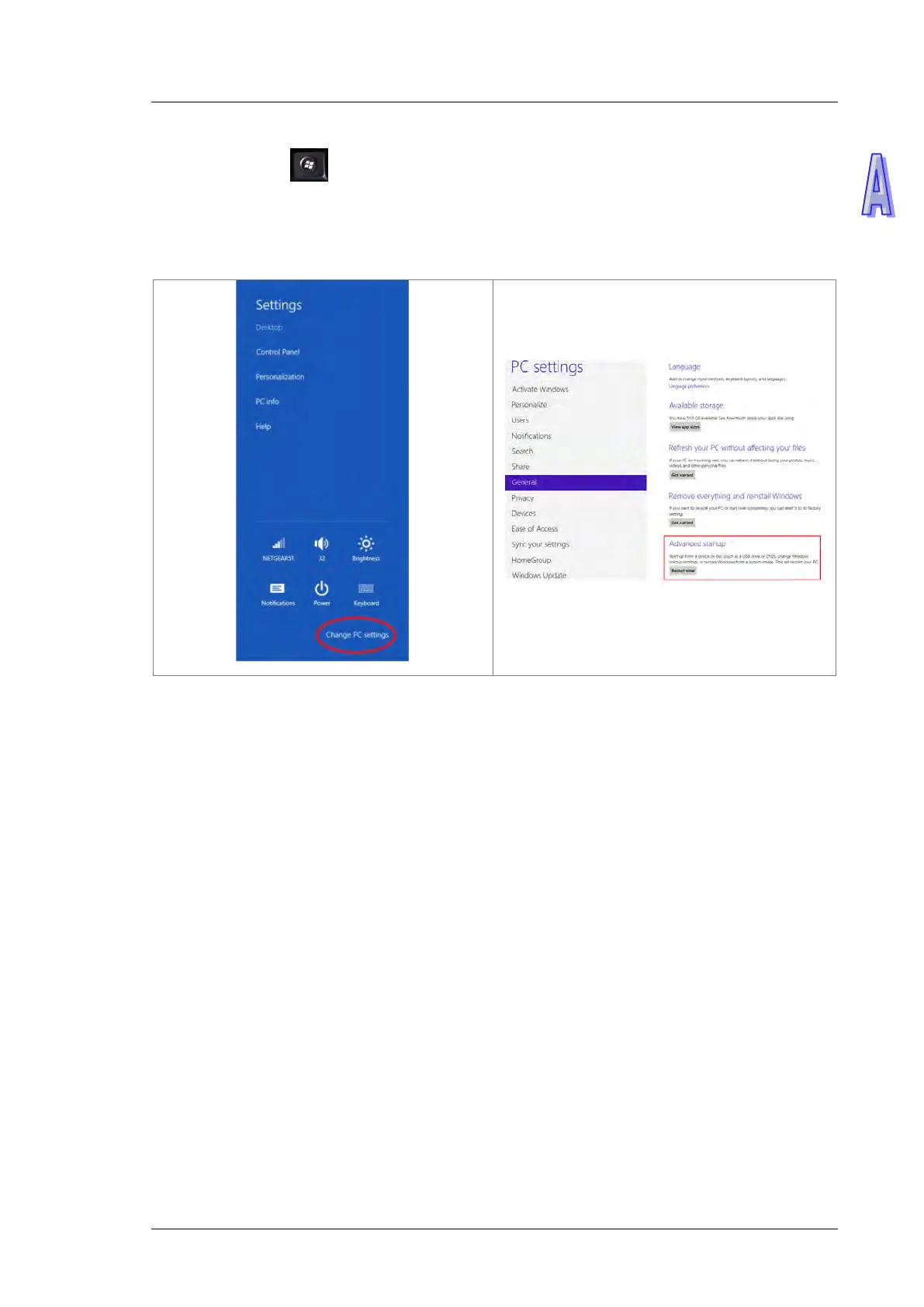 2. The PC settings window will appear. Select “General” and then “Restart now” under “Advanced startup”.