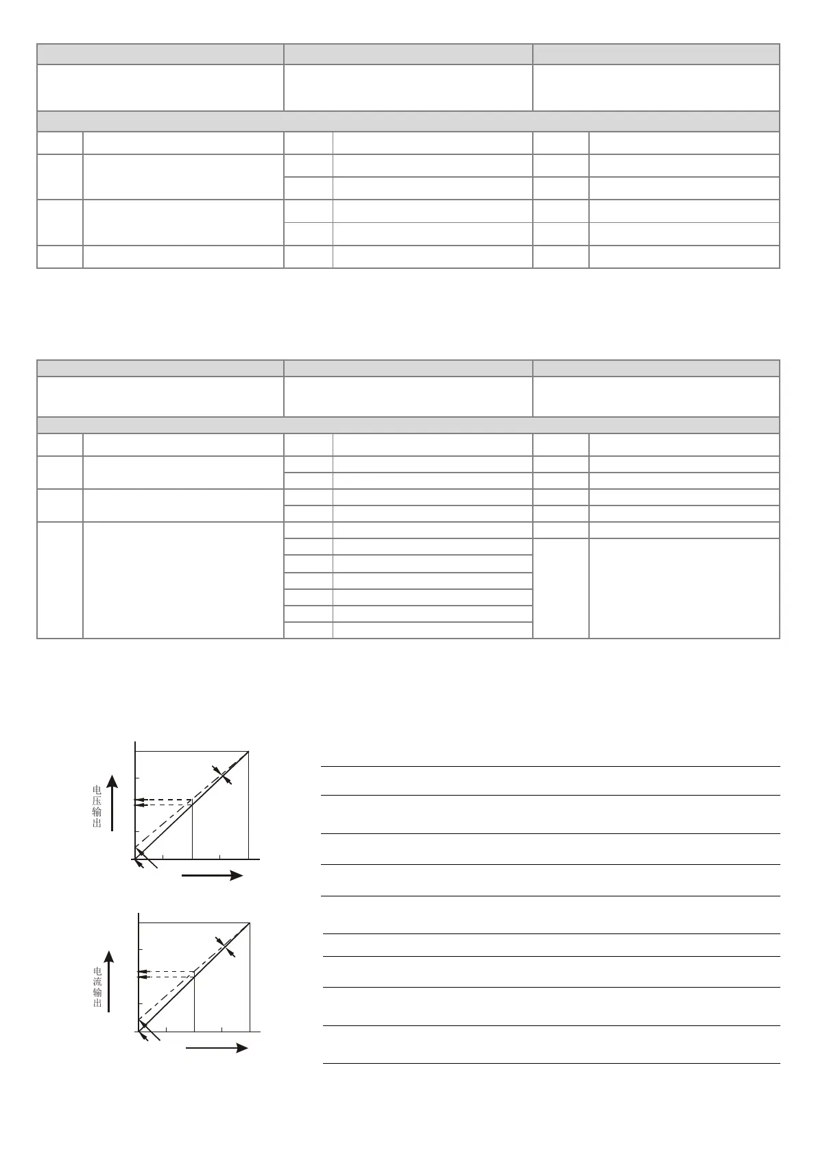 上列表示电压输出模式与电流输出模式的 D/A 转换特性曲线,使用者可依据实际应用需要来调整转换特性曲线,调整