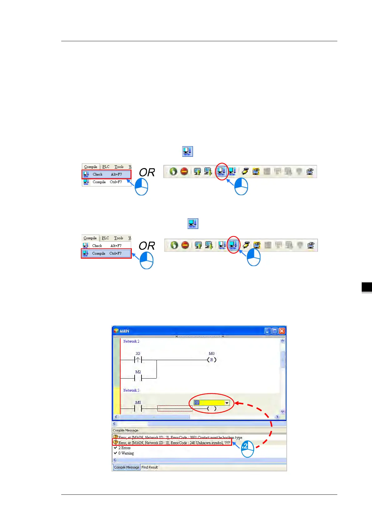 system automatically shows you where the error occurs. You can run the Check function or the Compile
