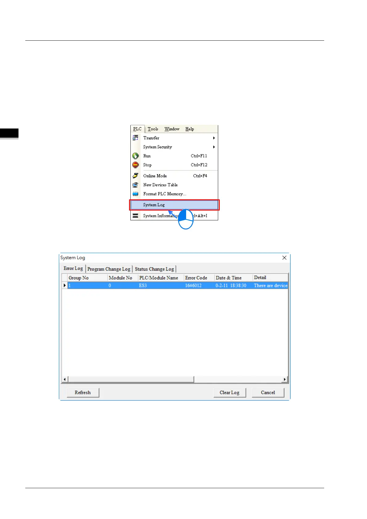 (2) The System Log window appears. Click Clear Log to clear the error log in the window and the error log in the CPU