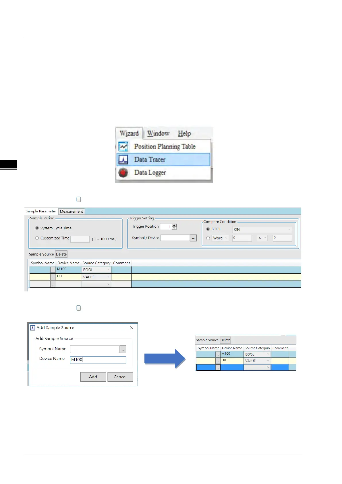 Data Tracer is used for the real-time collection of variable symbols, values, states in devices, after some trigger condition