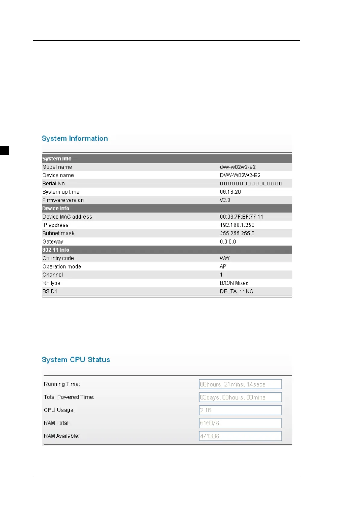 This page summarizes the current status of CPU. It includes Running Time, Total Powered Time, CPU Usage,
