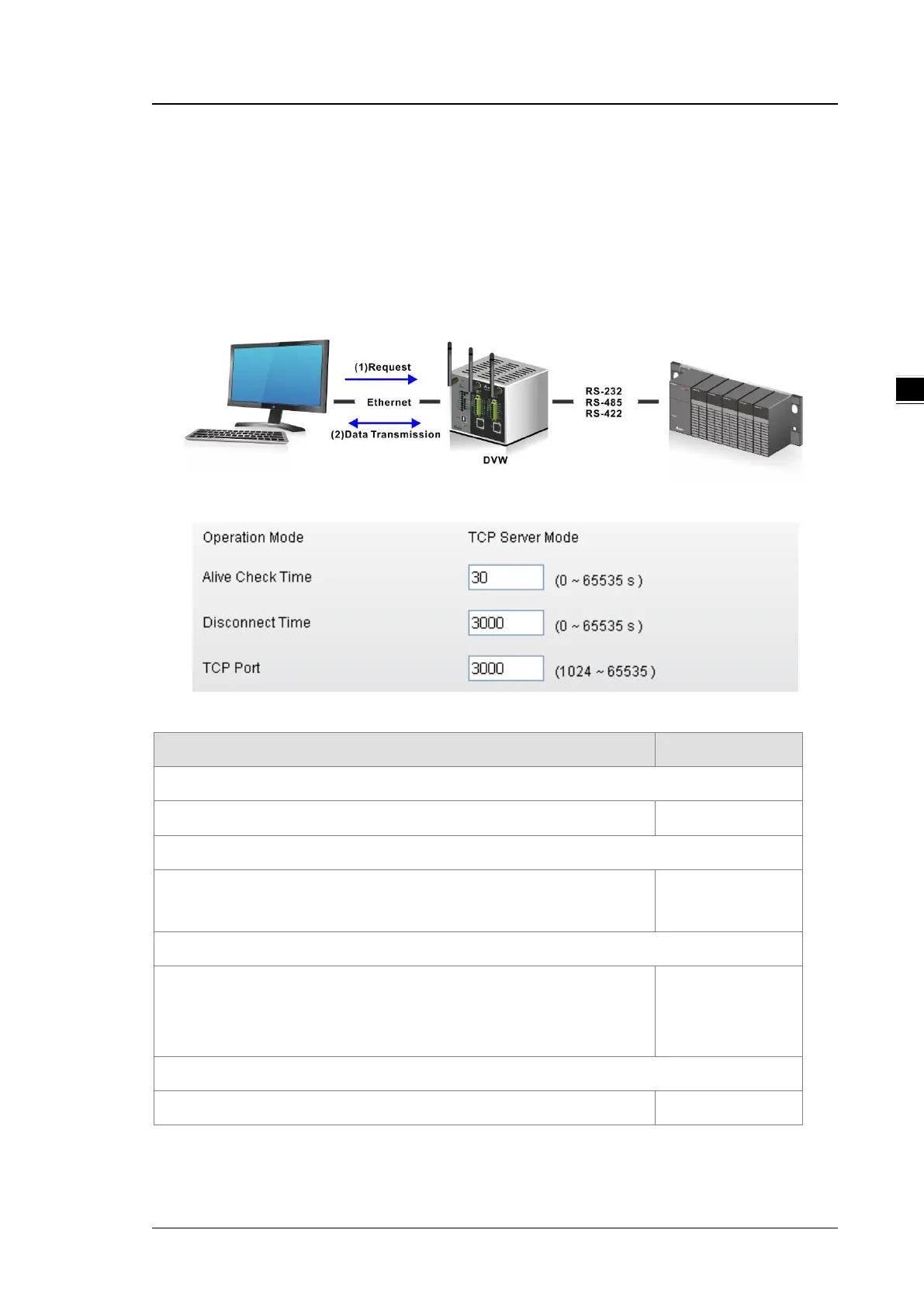 In TCP Server Mode, DVW series works as a passive role. DVW series waits the connected requirement from