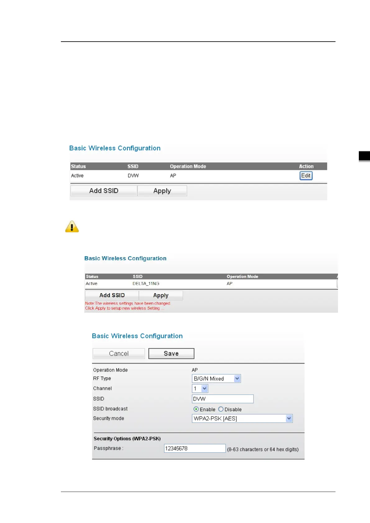 After you specify the Operation Mode, please add a SSID in Basic Wireless Configuration page. And click Edit