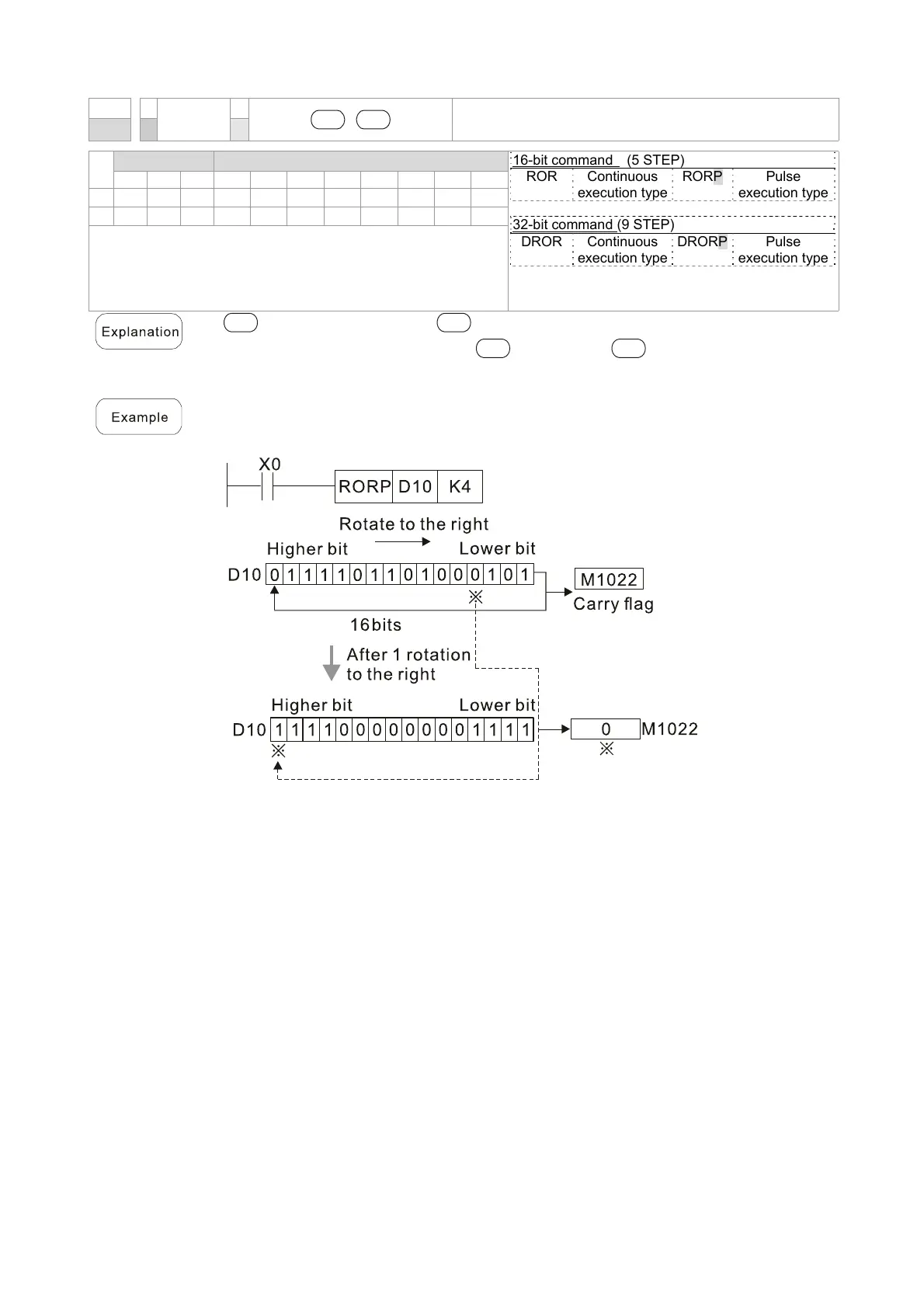 When X0=Off→On, 4 of the 16 bits in D10 specify a right rotation; the content of