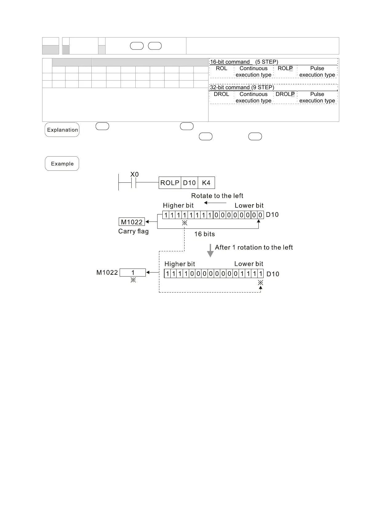 When X0=Off→On, 4 of the 16 bits in D10 specify a left rotation; the content of the