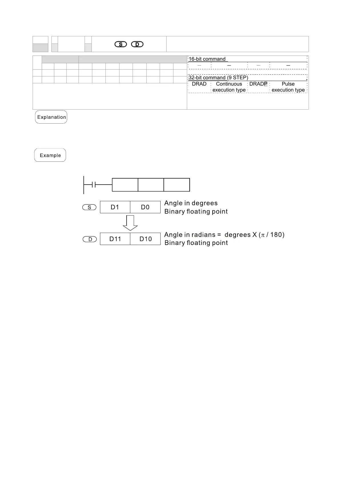 When X0=On, the angle of the designated binary floating point number (D1, D0)