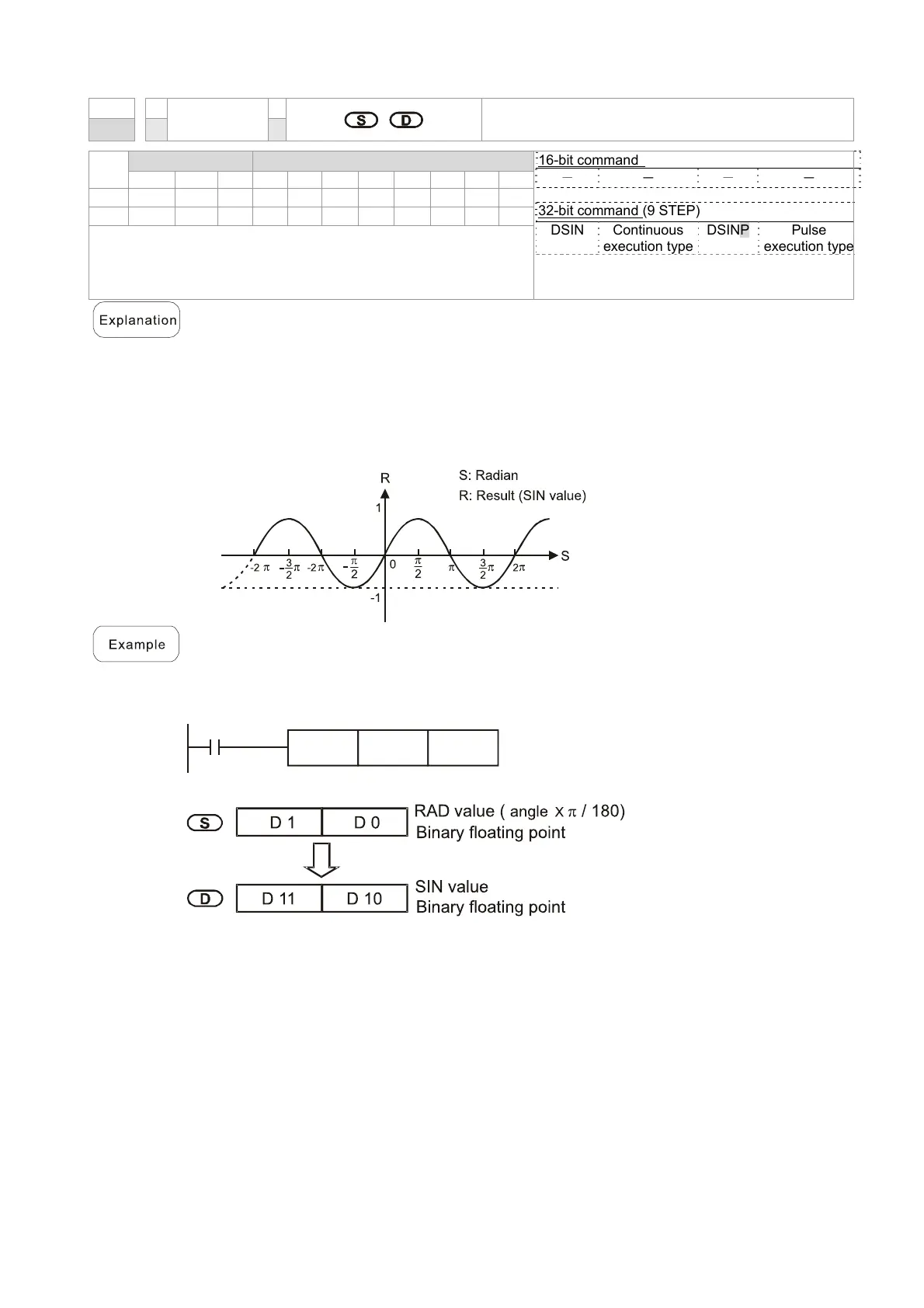 D0) in radians (RAD) will be stored in (D11, D10), with the content consisting of a