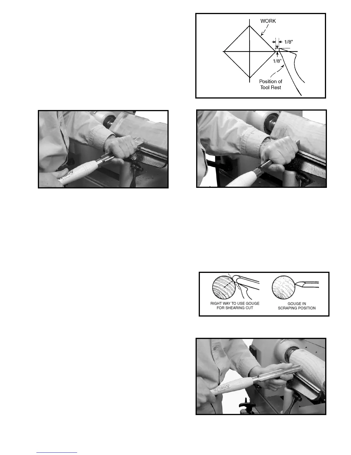 you. (2) Roll the gouge over slightly in the same direction as you advance the cut. (3) Hold the tool well up on the workpiece,