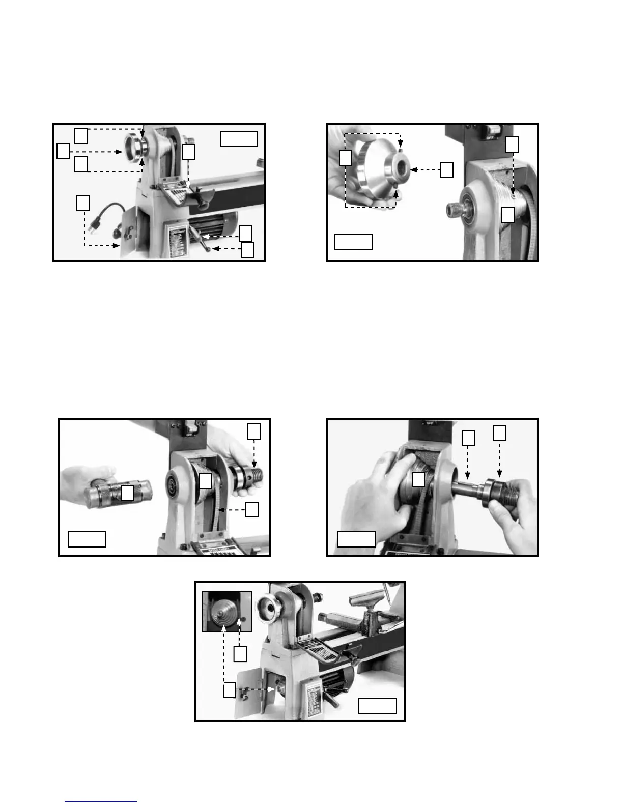 8. IMPORTANT : Lors de l’assemblage de la broche et du volant, serrer les vis de calage de la poulie de la broche contre la