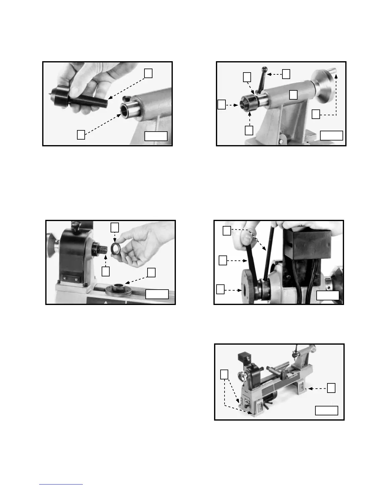 1. Instale el espaciador (A), Fig. 12, en el eje de la contrapunta (B).