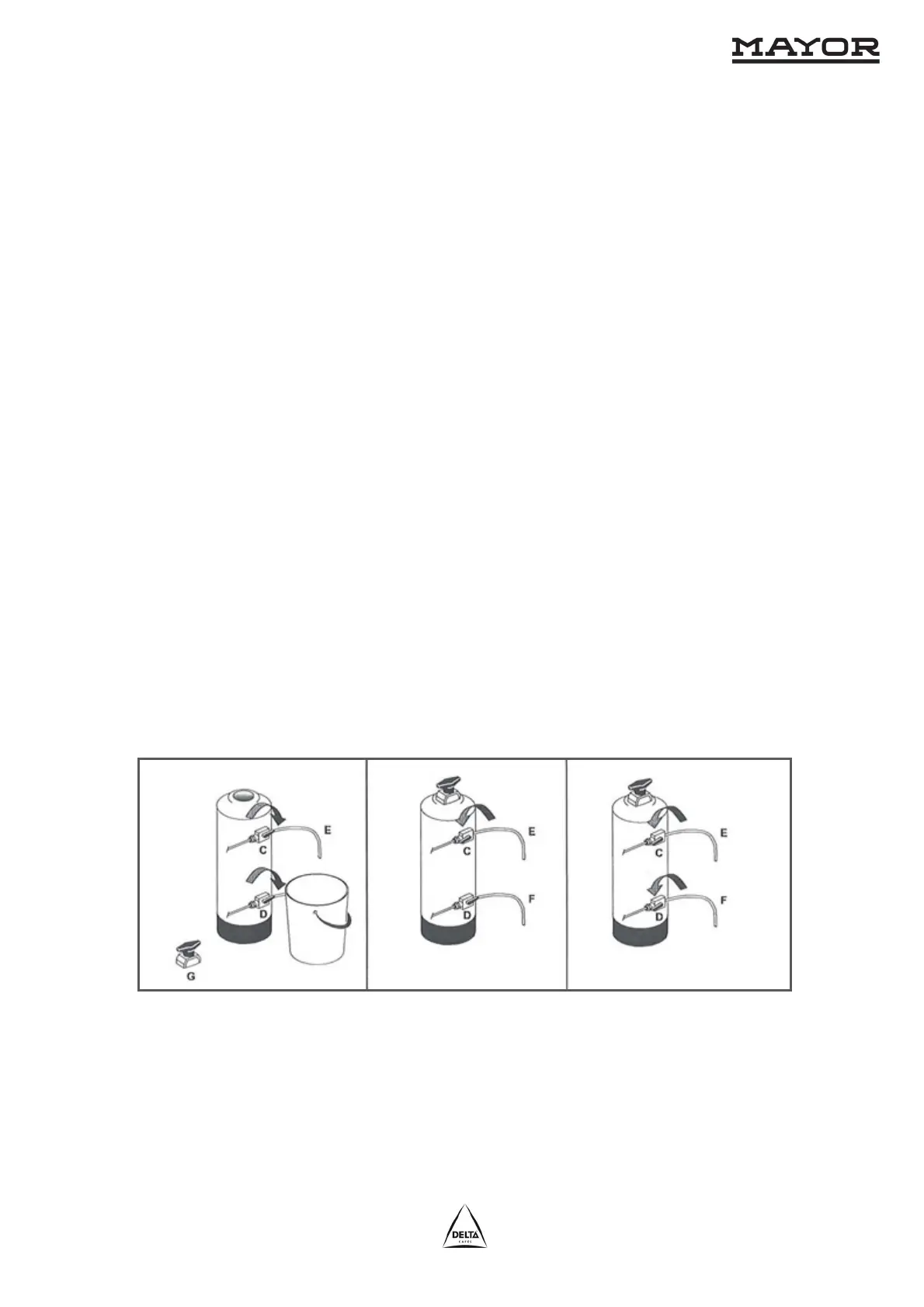 1. Place a container with at least 2 litres capacity under tube E. Turn handles C and D from left