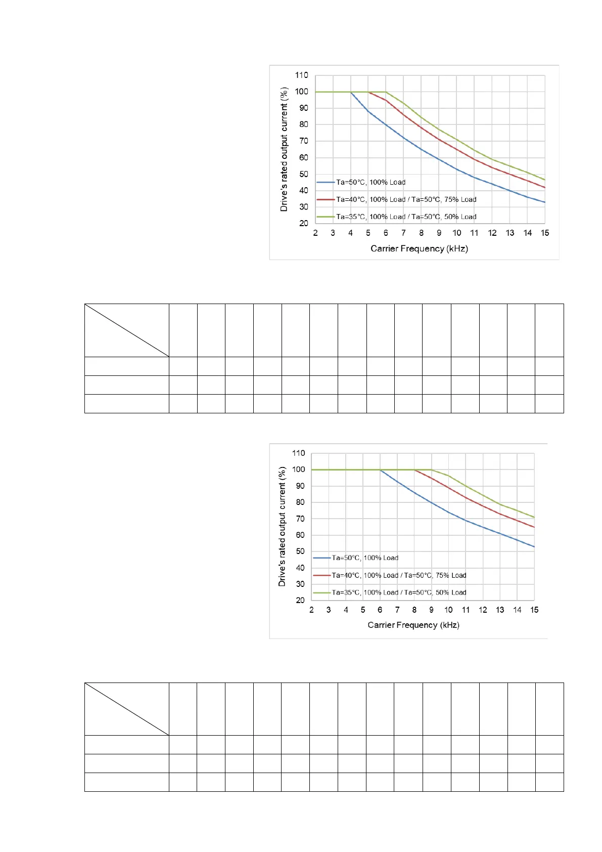 The rated output current (%) of DPWM in heavy load for different carrier frequencies: