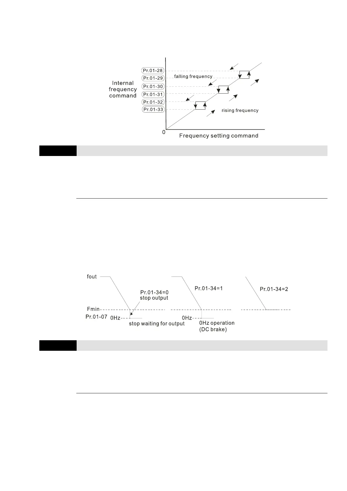 When the frequency command of drive is less than Fmin (Pr.01-07, Pr.01-41), the drive operates