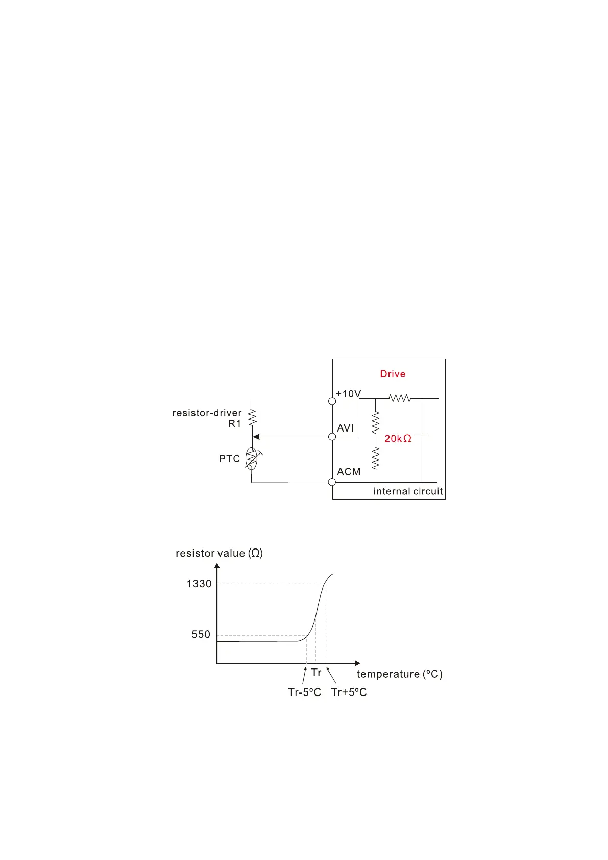 Protection level (Pr.06-30) = V + 10 × (RPTC//20K) / [R1 + (RPTC//20K)]